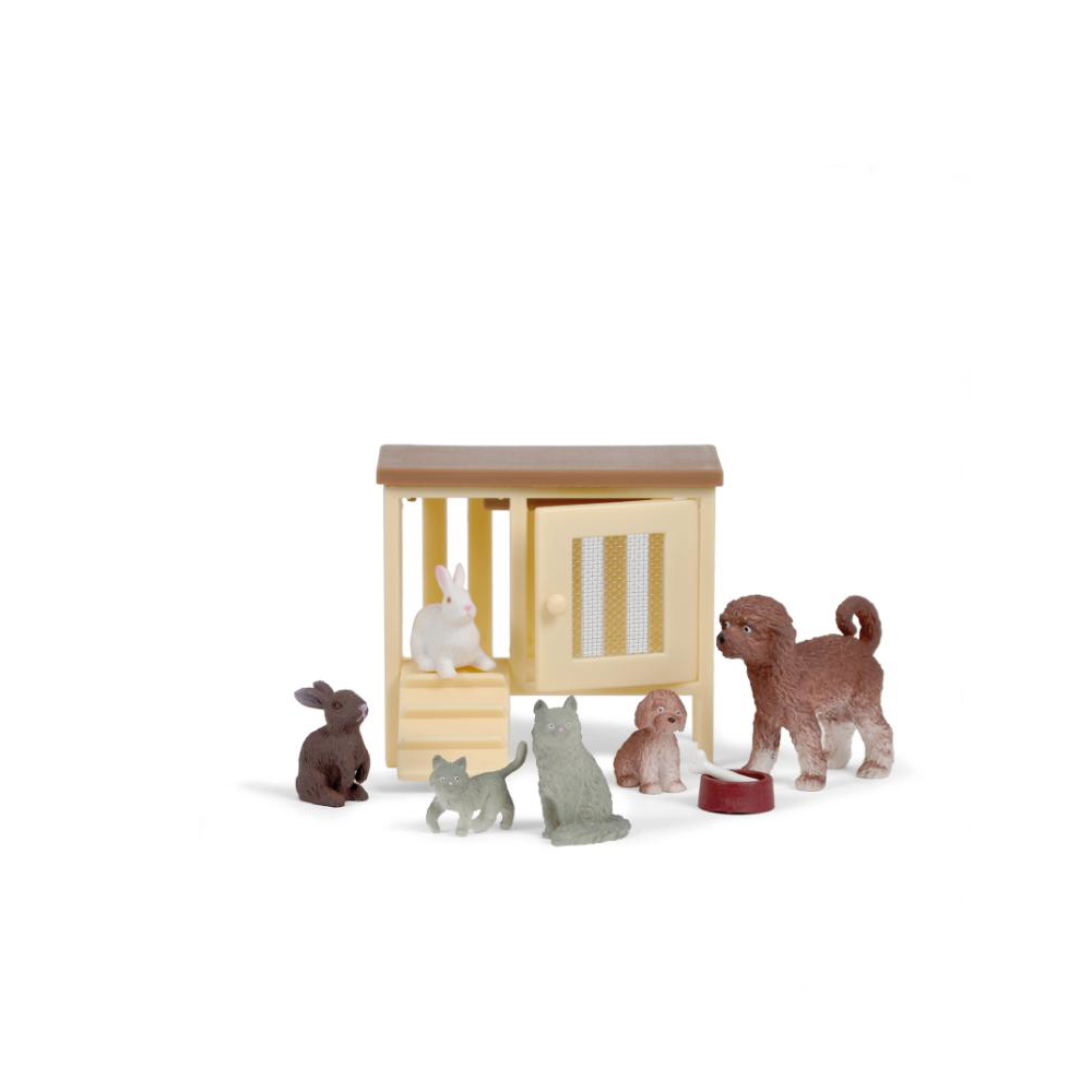 Lundby Dukkehus - Kæledyrs sæt m/Kanin, Kat, Hund, Bur og Skål