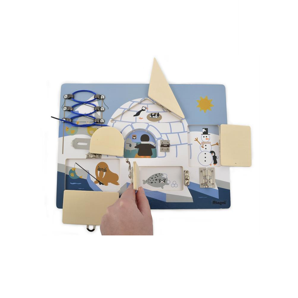 Låsebræt med is-tema. Lås brikker op og se, hvad der gemmer sig bagved hvalrossen, sælen eller pingvinen. Et låsebræt er god træning for børnenes fin motorik. En god aktivitet for de mindste
