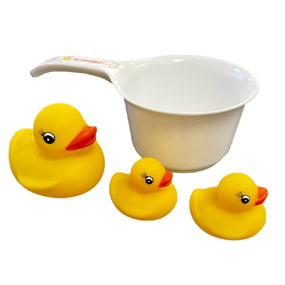 Badeænder i en praktisk kop med håndtag. Den gule andemor og hendes to ællinger gør badet sjovt og underholdende for ethvert barn.