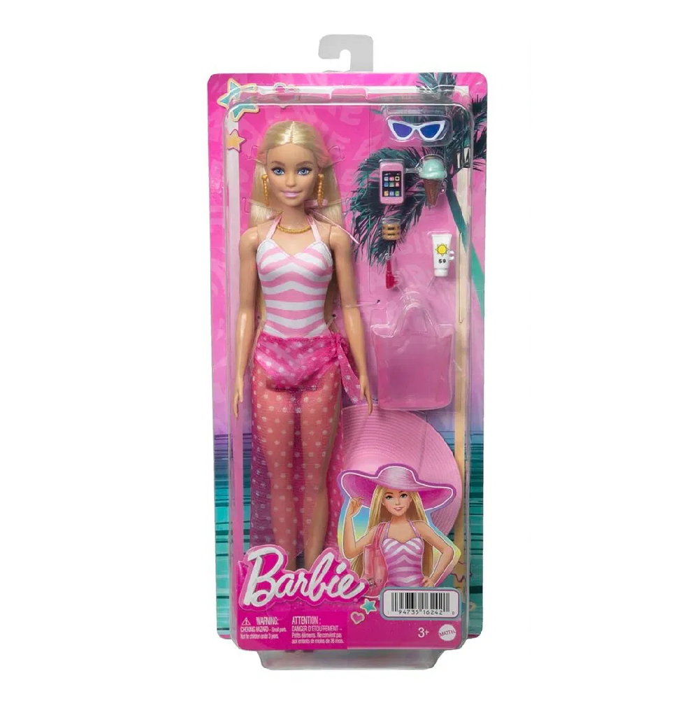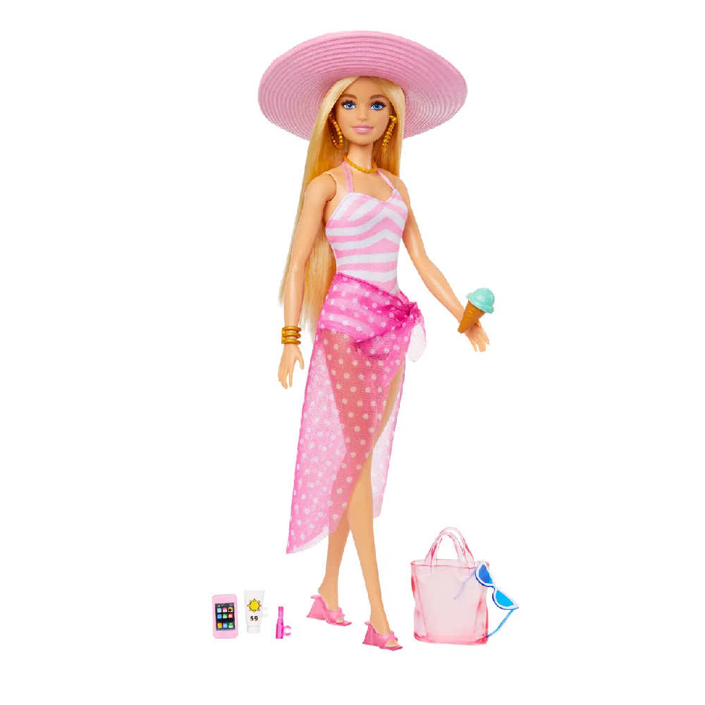 Med fødderne i sandet og en is i hånden er den blonde Barbie-dukke klar til en afslappende dag i Malibu. Hun er iført en sommerlig pink badedragt og har en mulepose fyldt med ting til en dag på stranden.
