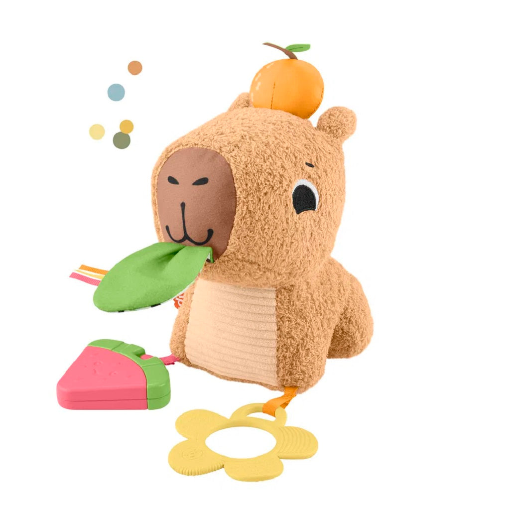 Kramme-kapivaren er sød, blød og klar til leg. Dette plyslegetøj til babyer fra Fisher-Price er fyldt med mange sanse-detaljer, som dit lille barn kan udforske. Kapivaren har lyse farver, teksturerede materiale og sjove lyde og har sine egne 'snacks', der er designet til at aktivere din babys sanser under leg. Størrelsen er perfekt til nyfødte, og denne bløde, krammelige ven kan hjælpe med at give en følelse af tryghed og sikkerhed for dit barn, både hjemme og på farten. Farver og mønstre kan variere. Fra 3 mdr
