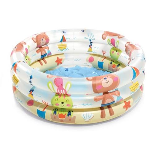 Her er en pool som opmuntrer til masser af sjov og underholdning! Den perfekte måde at bruge en varm sommerdag på. Denne INTEX-pool består af tre ringe med de sødeste dyremotiver af dyr der hygger på stranden. Bassinet har derudover en blød, oppustelig bund.