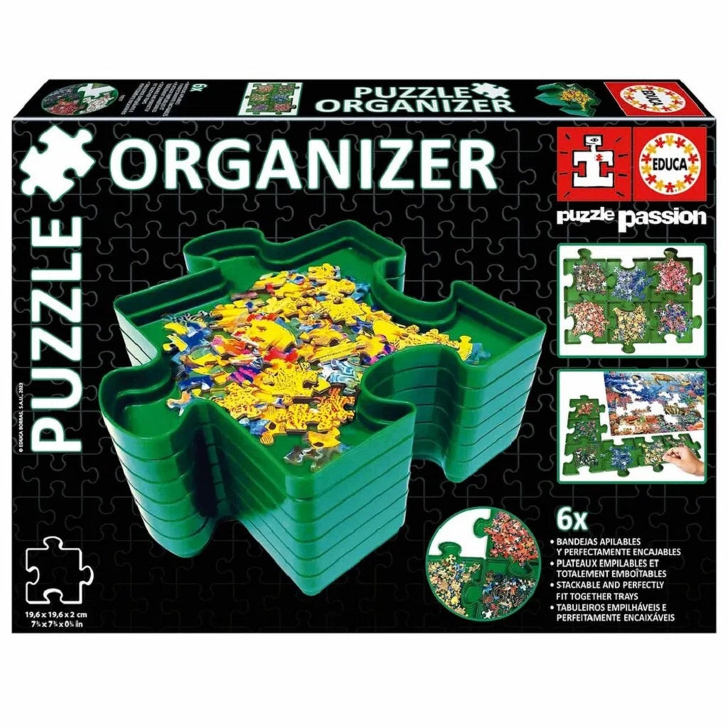 Educa Sorterer er puslespilstilbehør til sortering og organisering af brikker efter farve eller form. De 6 bakker, der måler 19,6 x 19,6 x 2 cm, kan stables eller samles vandret, som man ønsker. Bakkerne passer perfekt sammen.