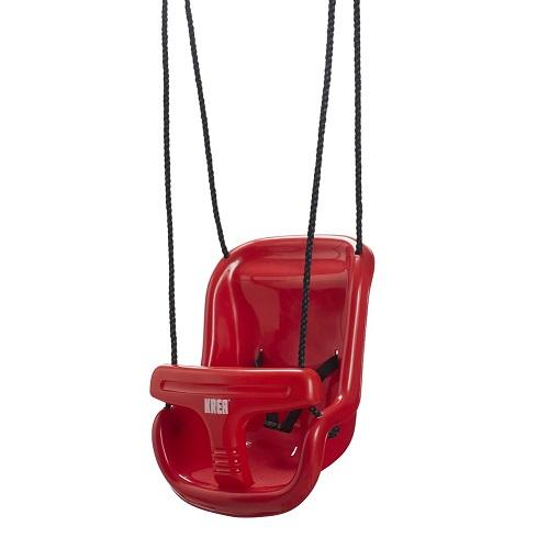 Denne Krea gynge er designet til små børn fra 6 mdr. så de sidder sikkert og godt. Foran er der en bøjle der lige er til at skubbe op så barnet kan sættes i den. Den solide konstruktion med høj ryg støtter barnet samt nakke/hoved.