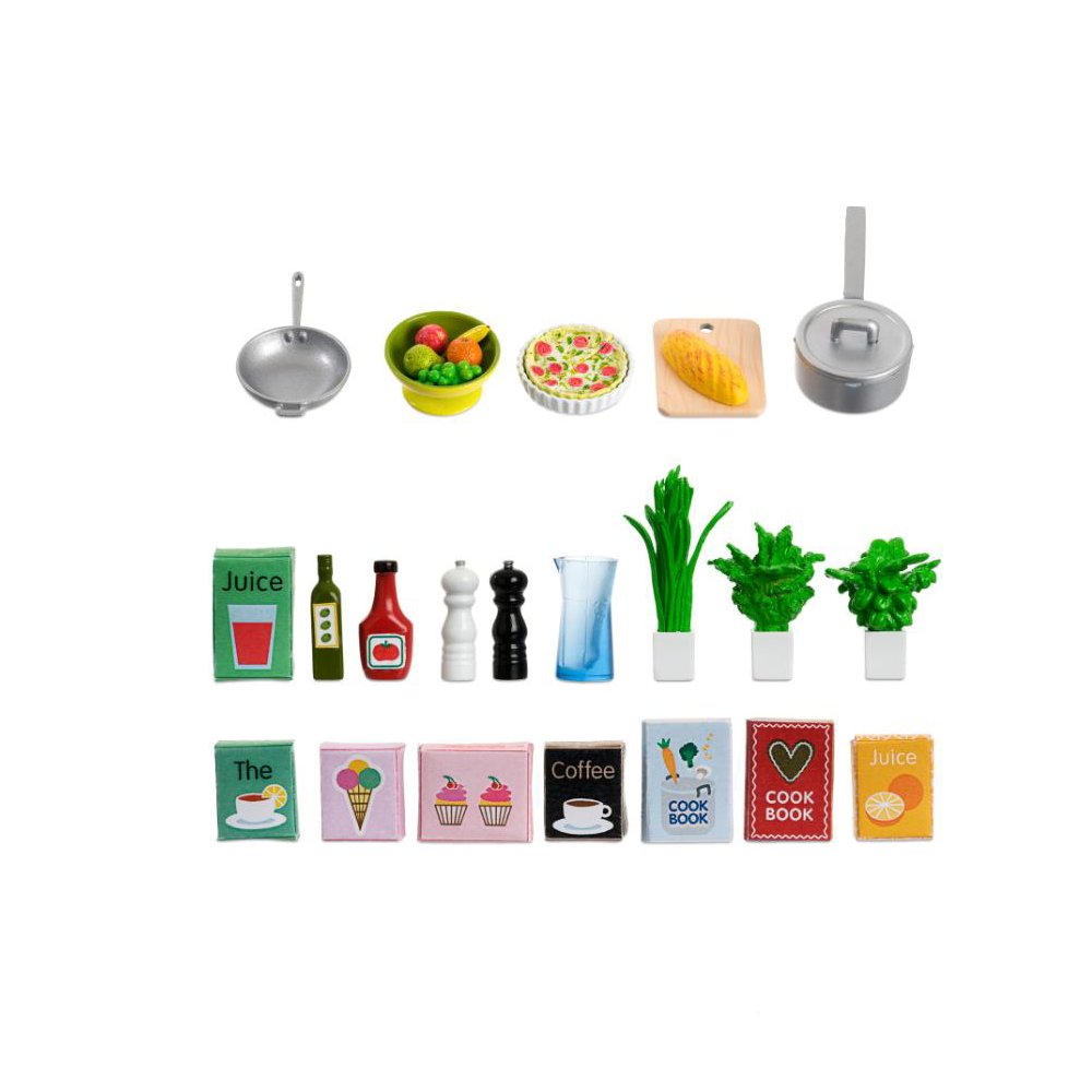 Disse flotte madvarer og andet køkkentilbehør vil give autentiske detaljer til ethvert dukke køkken.