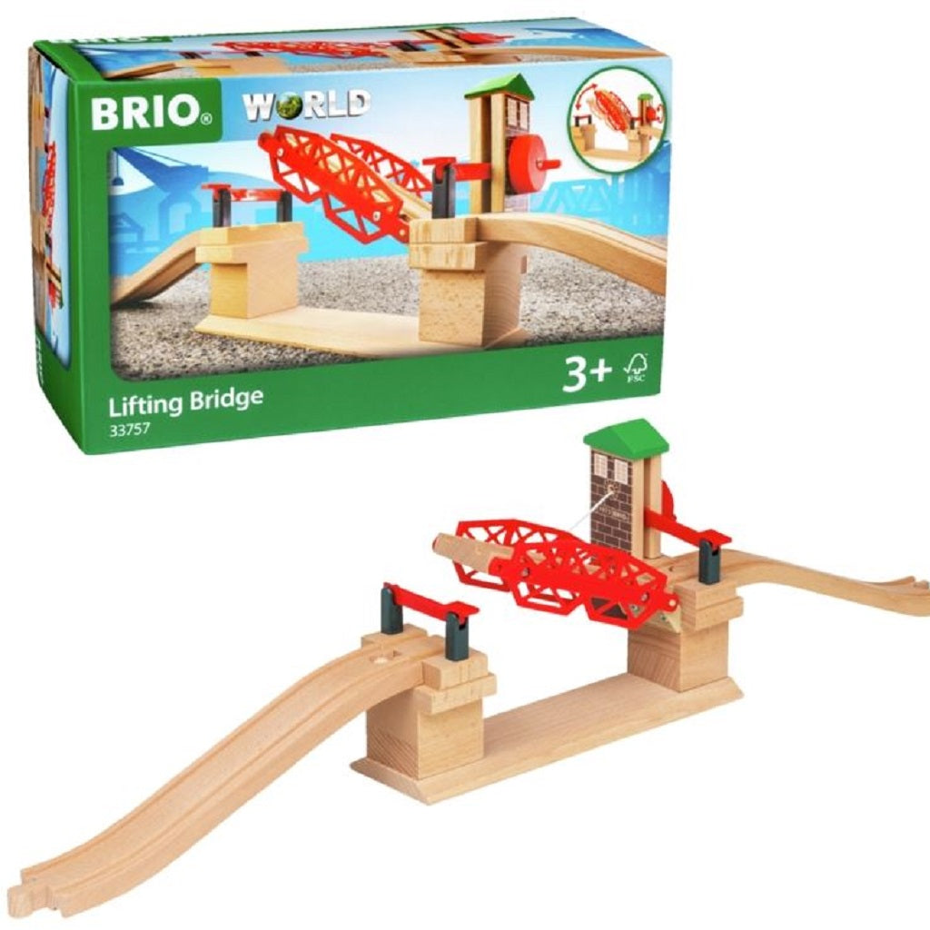 Nu er det tid for båden at passere. Før stopbommene ned og drej håndtaget for at løfte broen op. Med til broen hører 2 opfartsskinner, der passer til alle BRIO togbaner. 3 dele. Fra 3 år