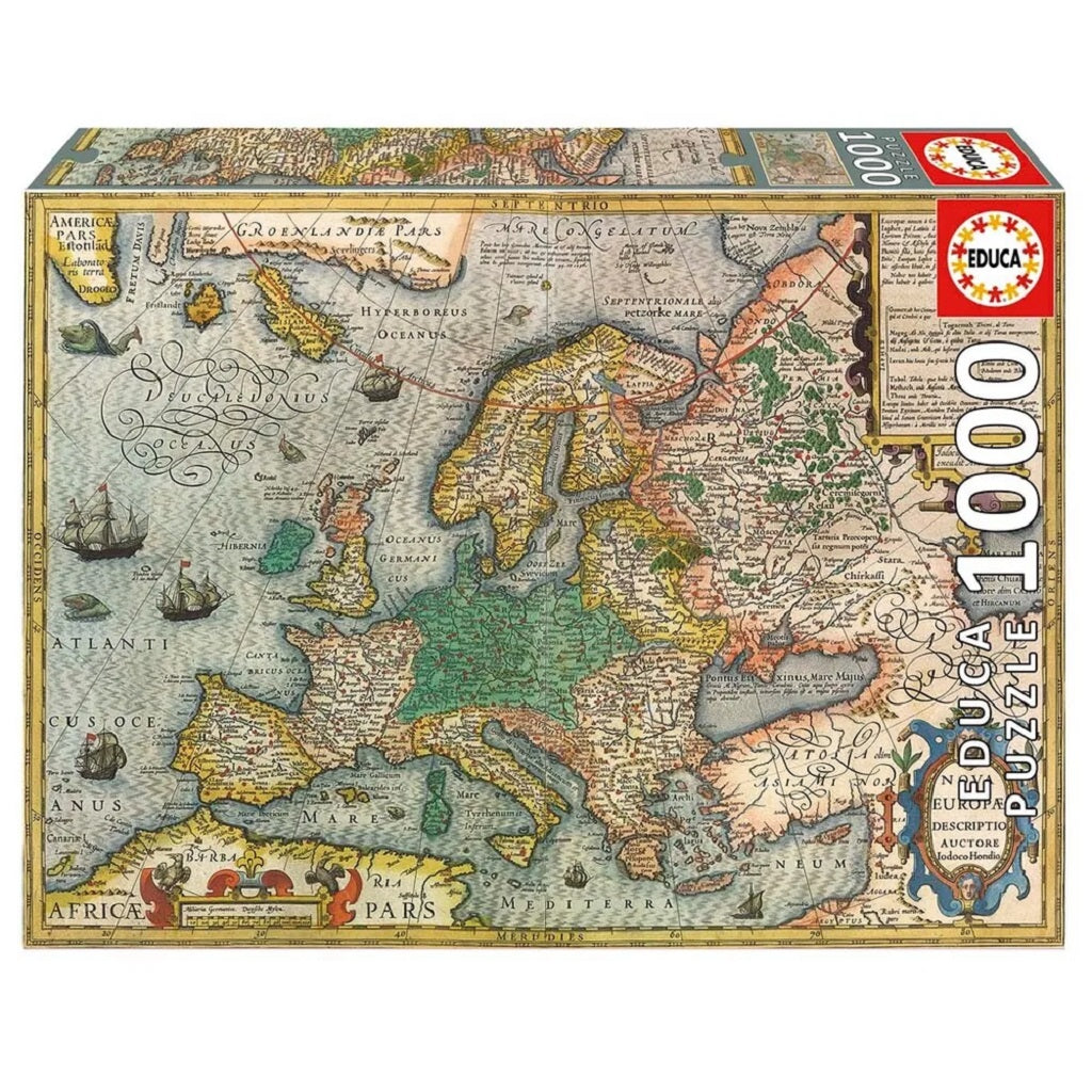 Puslespil med motiv af Europa-kort. Sættet indeholder 1000 puslespilsbrikker. Samlet mål: 68 x 48 cm. Fra 14 år.