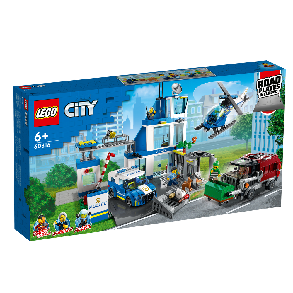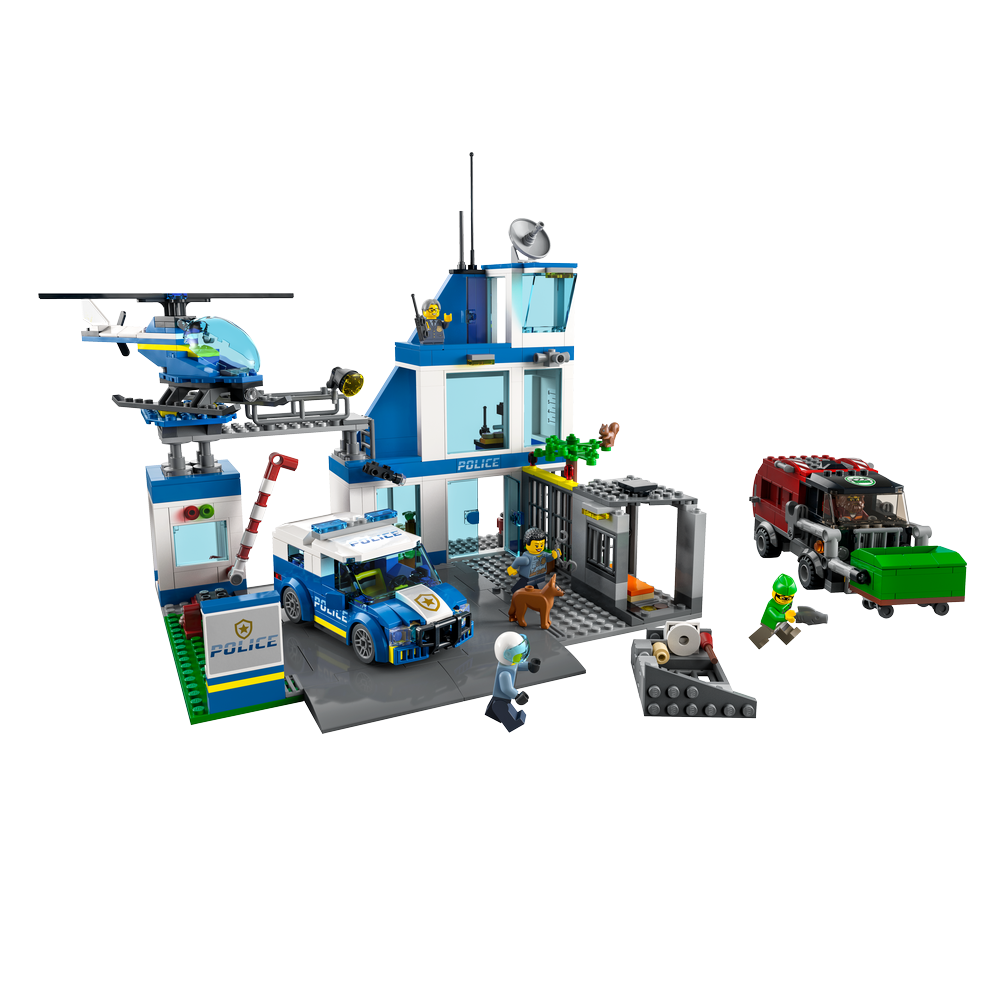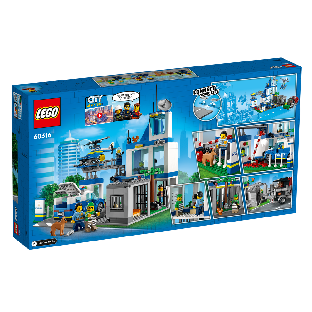LEGO® City legetøjet Politistation (60316) i 3 etager er fyldt med inspirerende detaljer, bl.a. et fængsel med en flugtfunktion, et område til en skurks gårdtur og et område til hundetræning. Børn får også en politibil, helikopter og skurkenes specialbyggede skraldebil samt en vejplade, som kan forbindes til andre legesæt. Bare tilføj de 5 minifigurer, herunder 3 karakterer fra tv-serien LEGO City Adventures, og lad legen begynde.