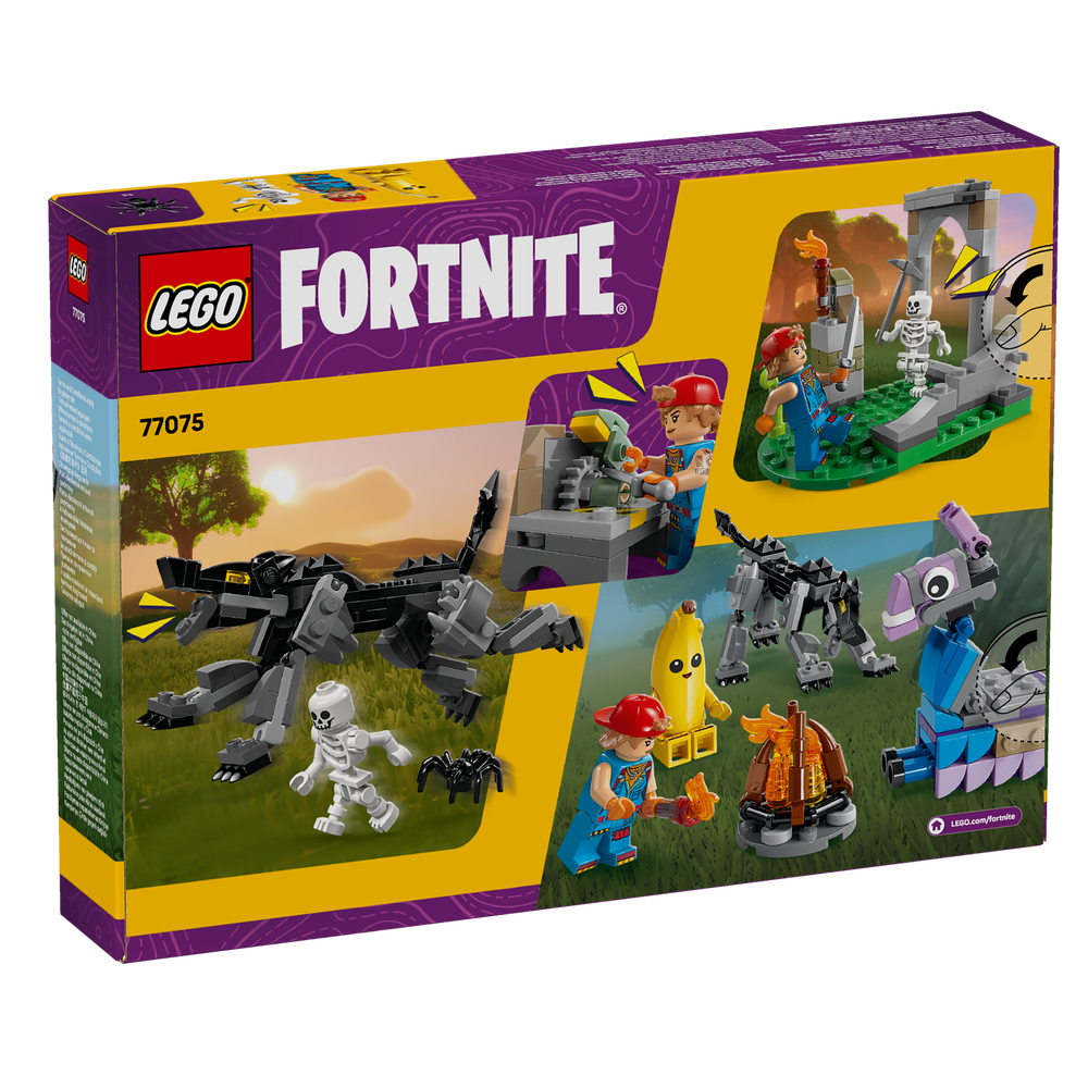Glæd gamere med LEGO® Fortnite® byggesættet Peely og Sparkplugs lejr (77075) til børn fra 7 år. Det videospil-inspirerede sæt er fuldt af genkendelige elementer og ikoniske figurer og inspirerer fans til at finde på deres eget LEGO Fortnite eventyr. Legesættet genskaber de første udfordringer, spillerne møder i videospillet LEGO Fortnite Odyssey, og drenge og piger vil få det sjovt med at bygge lejrbålet, et arbejdsbord og ruiner, der kan nedbrydes og omkonfigureres. Sættet omfatter også en figur af en Supply Llama og en ulvefigur med hale og ben, der kan bevæges. Den spændende action vækkes til live af minifigurer af Peely, Sparkplug og et skelet med våbentilbehør, der inspirerer til fantasifuld rolleleg. Legesættet er en fantastisk gave med videospiltema til børn og gamere i alle aldre og låser op for en bonus i LEGO Fortnite videospillet i form af et særligt Sparkplug-outfit, som byggere indløser ved at scanne QR-koden på forsiden af byggevejledningen.