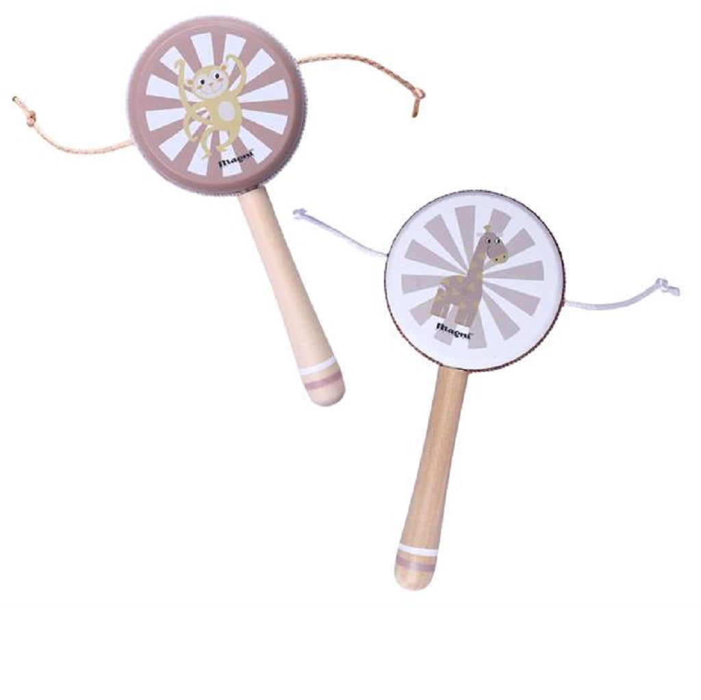 Denne håndtromme med dyremotiv er perfekt til små musikalske opdagere. Let at håndtere for selv de mindste børn, kan trommen vendes fra side til side for at skabe lyd og rytme. Håndtrommen findes i to forskellige motiver: abe og giraf, og leveres assorteret. Ideel til børn fra 3 år og op.