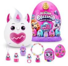 Klæk dig ind i alle de nye Rainbocorns Eggzania! Dette æg oser af over 20 overraskelser og splinternye skøre, søde Rainbocorns-figurer. Fjern ægget fra reden for at udklække din super-squishy Rainbocorns Eggzania-plys, komplet med matchende Yolkie, 5 miniæg og en Eggzania-joke, der vil få dig til at knække af grin! Gå ind i Rainboville med stil med bærbart tilbehør, herunder en ring, stempel og gør-det-selv-armbånd, der matcher din Eggzania! Disse silkebløde Rainbocorns elsker at putte og vil få dig til at se livet med solsiden opad! Hvilket Eggzania plys vil du udklække