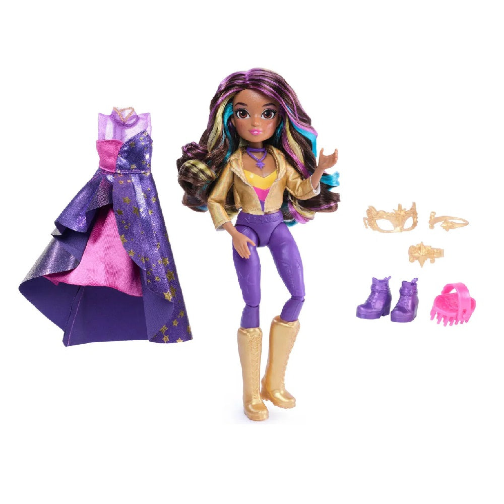 Når det er tid til ballet, kan du skifte Sophia fra hendes aftagelige jakke, halskæde og støvler til hendes stjernemønstrede kjole, bælte, maske og lilla støvletter. Hendes hår styles nemt i en opsat frisure med den medfølgede hårklips.